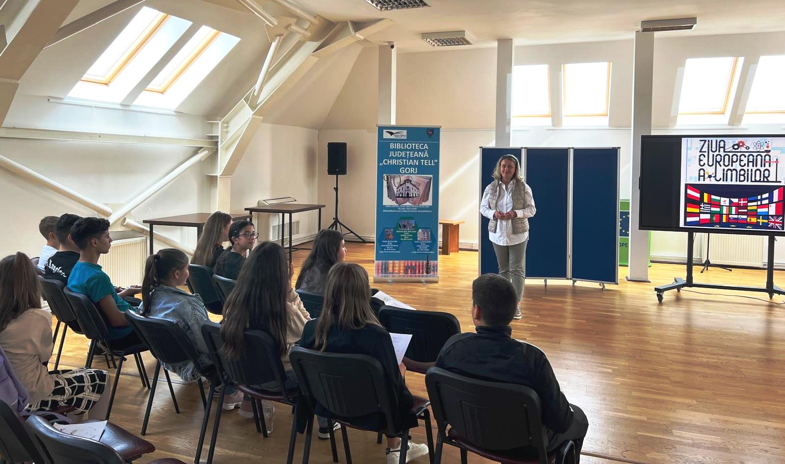 Biblioteca Județeană ”Christian Tell” Gorj a marcat în avans, săptămâna trecută, „Ziua Europeană a Limbilor”, un eveniment desfășurat la MansArta bibliotecii, alături de elevii de gimnaziu ai Școlii Gimnaziale Sâmbotin, județul Gorj, însoțiți de profesoara de limba engleză și franceză Irina Nicoleta Șarapatin.