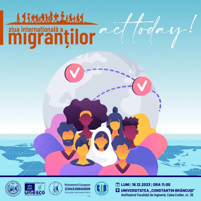 De Ziua Internațională a Migranților, echipa de Ambasadori Juniori ai Parlamentului European, împreună cu clasele XA, XC și XF de la Colegiul Național ”Tudor Vladimirescu” Târgu Jiu marchează astăzi evenimentul înscris în lista Aniversărilor UNESCO, începând cu ora 11:00, la Universitatea ”Constantin Brâncuși” – Amfiteatrul Facultății de Inginerie, Calea Eroilor, nr. 30.
