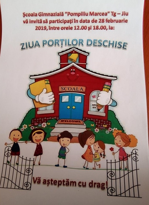 Şcoala Gimnazială „Pompiliu Marcea” (Nr. 11) din Târgu-Jiu organizează joi, 28 februarie 2018, între orele 12.00 şi 18.00 „ZIUA PORŢILOR DESCHISE“, eveniment dedicat părinților și copiilor care vor deveni elevi în clasa pregătitoare, în anul școlar 2019-2020, dar și altor persoane interesate de activitatea unității de învățământ. Viitorilori şcolari, dar şi părinţilor, li se vor prezenta spațiile școlare în care se vor derula activitățile claselor pregătitoare. Cadrele didactice vor oferi mai multe informații despre calendarul și metodologia de înscriere, programa școlară, activitățile școlare și extrașcolare, cât și despre programul ,,Școală după școală’’ (After school). Astfel părinții vor putea lua cea mai bună decizie pentru viitorul copiilor lor. Actele necesare la înscriere sunt: cerere-tip de înscriere; copii după actul de identitate al părintelui/tutorelui legal; certificatul de naştere al copilului; documentul care atestă dezvoltarea psihosomatică corespunzătoare pentru parcurgerea clasei pregătitoare, alte documente care să ateste îndeplinirea criteriilor generale şi/sau specifice (acolo unde este cazul).