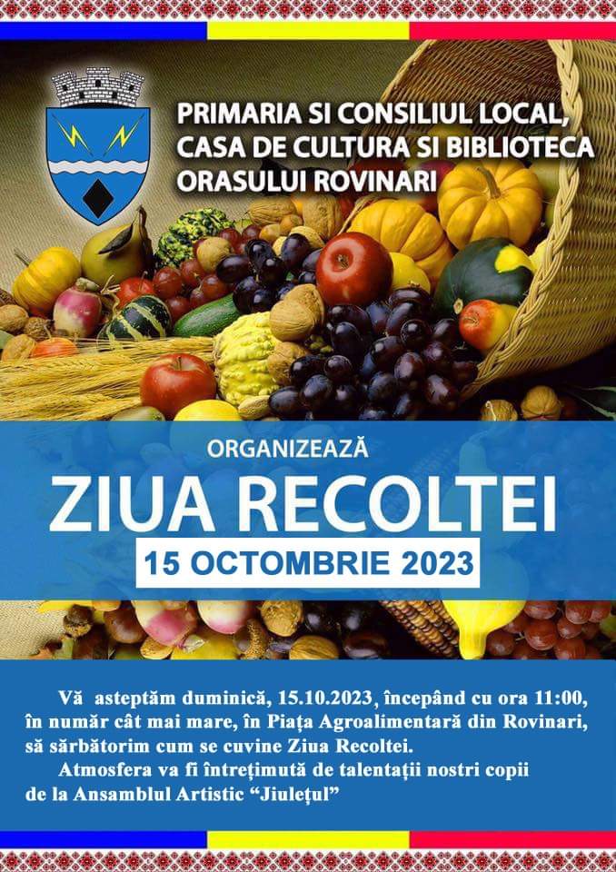 Primăria și Consiliul Local al orașului Rovinari vor organiza duminică, 15 octombrie, evenimentul Ziua Recoltei. Manifestarea va avea loc de la ora 11:00, în Piața Agroalimentară din Rovinari. Atmosfera va fi întreținută de copiii din cadrul Ansamblului Artistic „Jiulețul”.