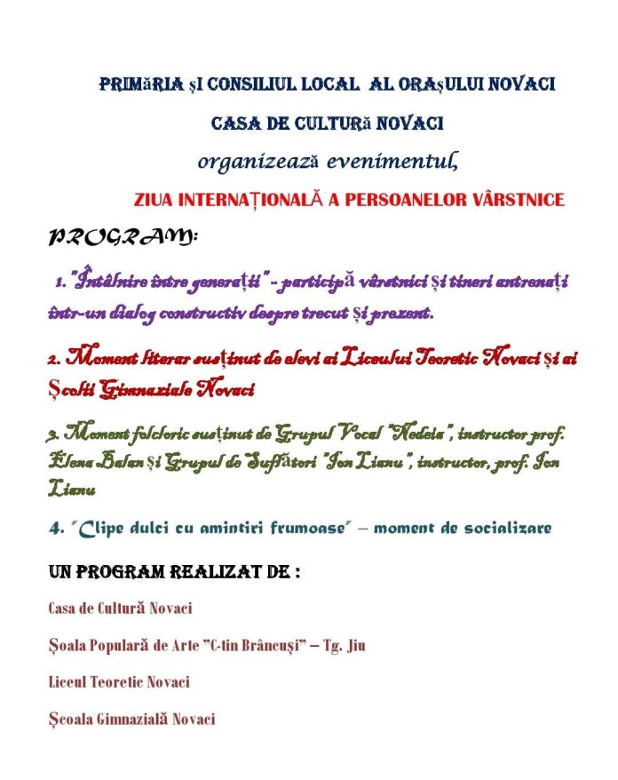 Mâine, la Novaci, autoritățile locale au pregătit mai multe manifestări culturale pentru pensionari, cu ocazia Zilei Internaționale a Persoanelor Vârstnice. Evenimentele programate vor fi organizate cu începere de la ora 11:00, la Amfiteatrul Liceului Teoretic Novaci.